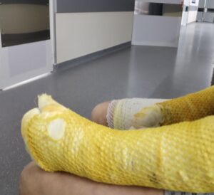 Un bărbat în vârstă de 44 de ani a povestit că a ajuns în Secția de Arsuri și Chirurgie Plastică pe 27 martie, în urma exploziei unei butelii de gaz, care a avut loc în gospodăria sa.